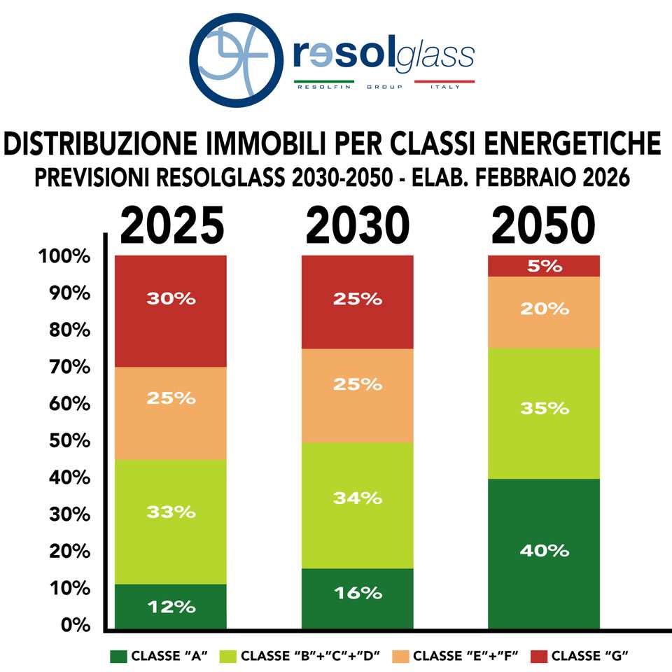 Secondo le «Previsioni 2030-2050 di Resolglass» in merito alla distribuzione in Italia degli immobili per classi energetiche, nel 2050 gli immobili in classe “A” dall’attuale 12% saliranno al 40%, mentre quelli in classe “G” scenderanno al 5% (1/6 rispetto al dato del 2025).
