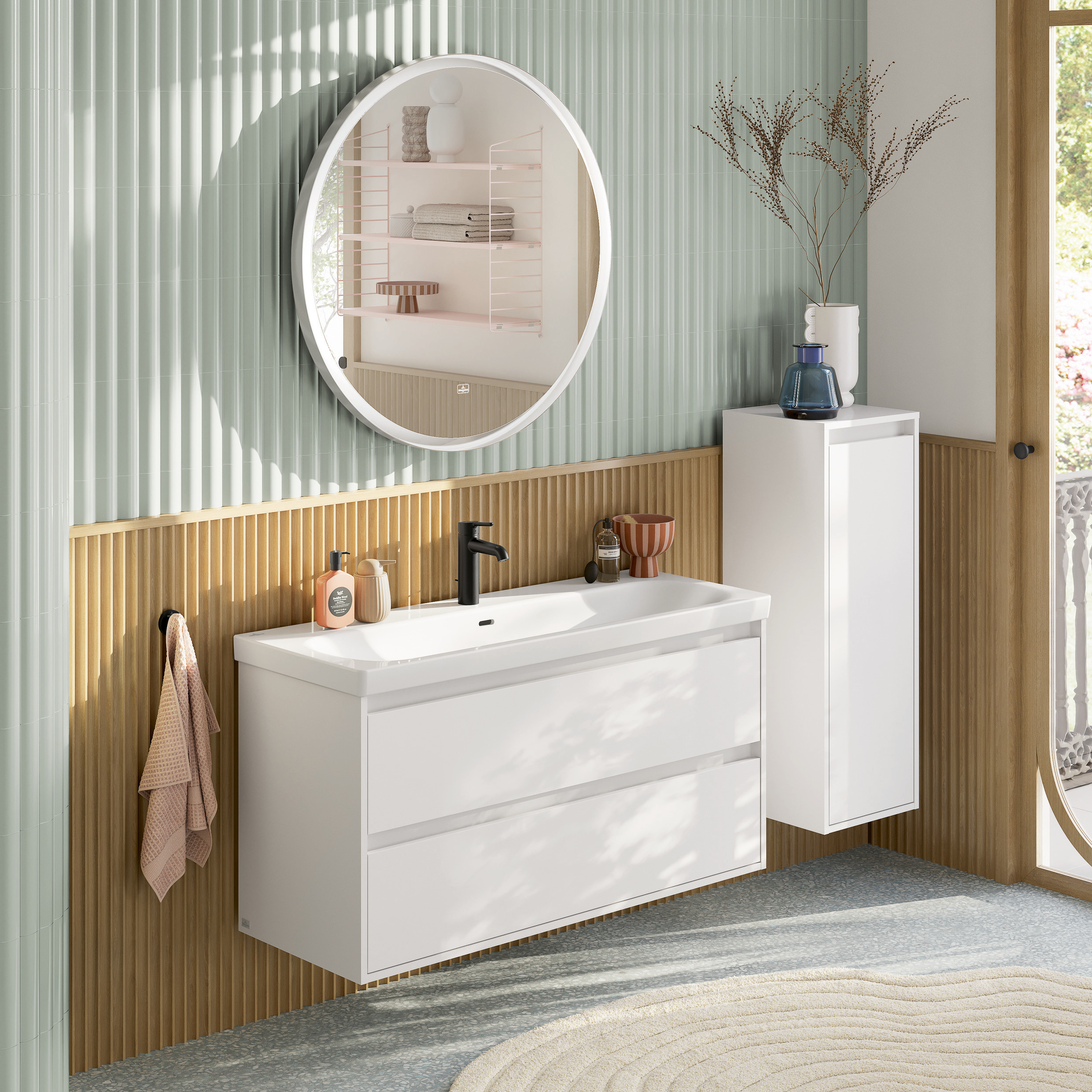 I mobili della collezione si distinguono per la grande versatilità delle soluzioni d’arredo. Otto tonalità moderne – dal classico Brilliant White al delicato Soft Green, fino al caldo Nordic Oak – permettono di personalizzare lo spazio secondo il proprio stile. Il mobile sottolavabo è disponibile in sei dimensioni (da 55 a 120 cm) per adattarsi facilmente a ogni ambiente. Su richiesta può essere configurato con uno o due cassetti; nelle versioni da 80 e 100 cm può essere abbinato a un vano a giorno, perfetto complemento per il lavabo asimmetrico. I frontali lisci e le maniglie incassate conferiscono ai mobili un’estetica pulita e ordinata, sottolineando la coerenza e la purezza del design Skyla.